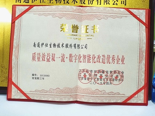經(jīng)江蘇省市場(chǎng)質(zhì)量監(jiān)督委員會(huì)、江蘇省數(shù)字化智能化改造調(diào)研中心、江蘇名牌事業(yè)促進(jìn)會(huì)綜合調(diào)查審核評(píng)議,南通伊仕生物技術(shù)股份有限公司符合江蘇省質(zhì)量效益雙一流·創(chuàng)新驅(qū)動(dòng)轉(zhuǎn)型升級(jí)優(yōu)秀企業(yè)的條件,被評(píng)為《江蘇省質(zhì)量效益雙一流·創(chuàng)新驅(qū)動(dòng)轉(zhuǎn)型升級(jí)優(yōu)秀企業(yè)》。